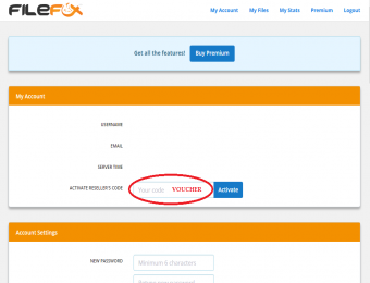 Zaloguj lub zarejestruj się na Filefox.cc po czym przejdź do ustawień klikając na My Account po czym wypełnij pole Activate Reseller's Code